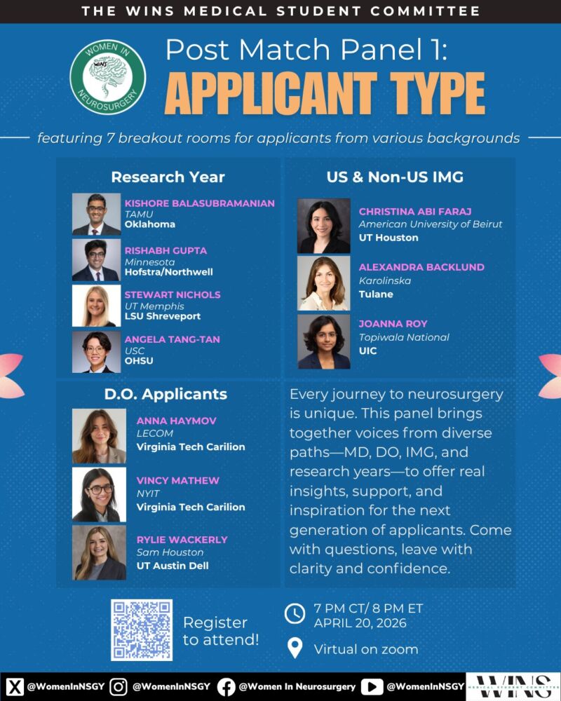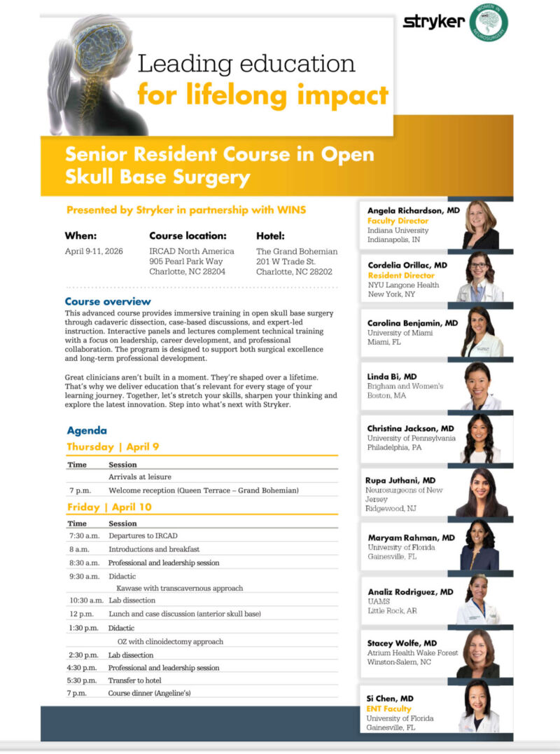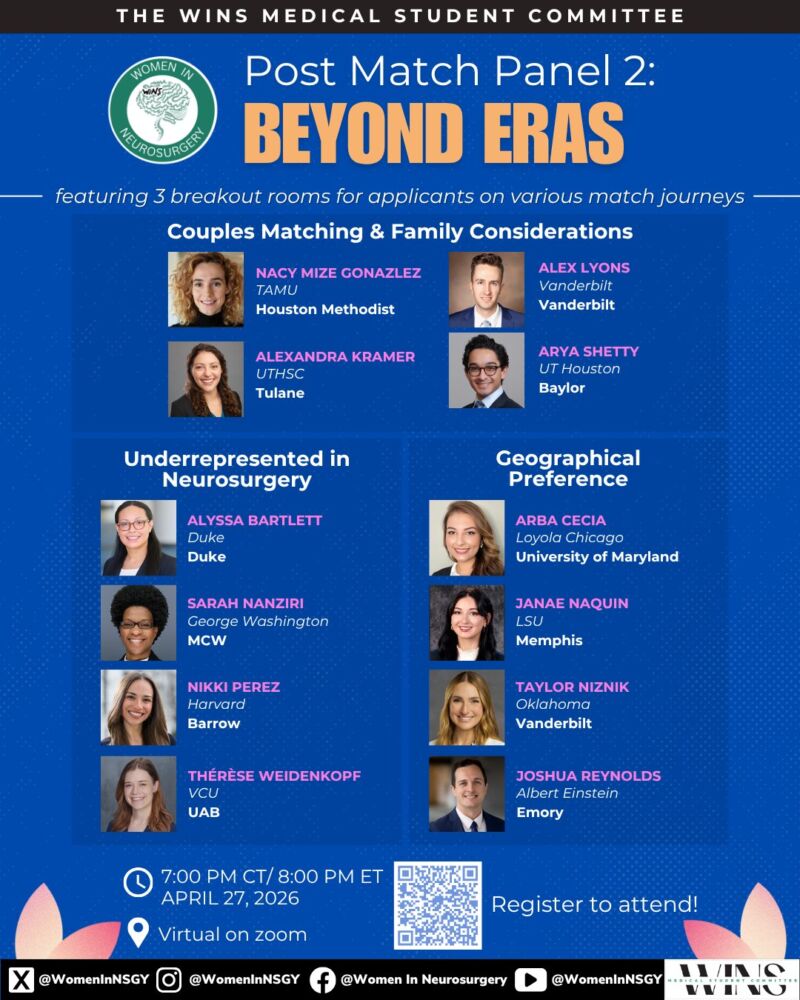 WINS aims to shine a spotlight on women in neurosurgery by celebrating achievements, breaking barriers, and inspiring the next generation of trailblazers in neurosurgery.