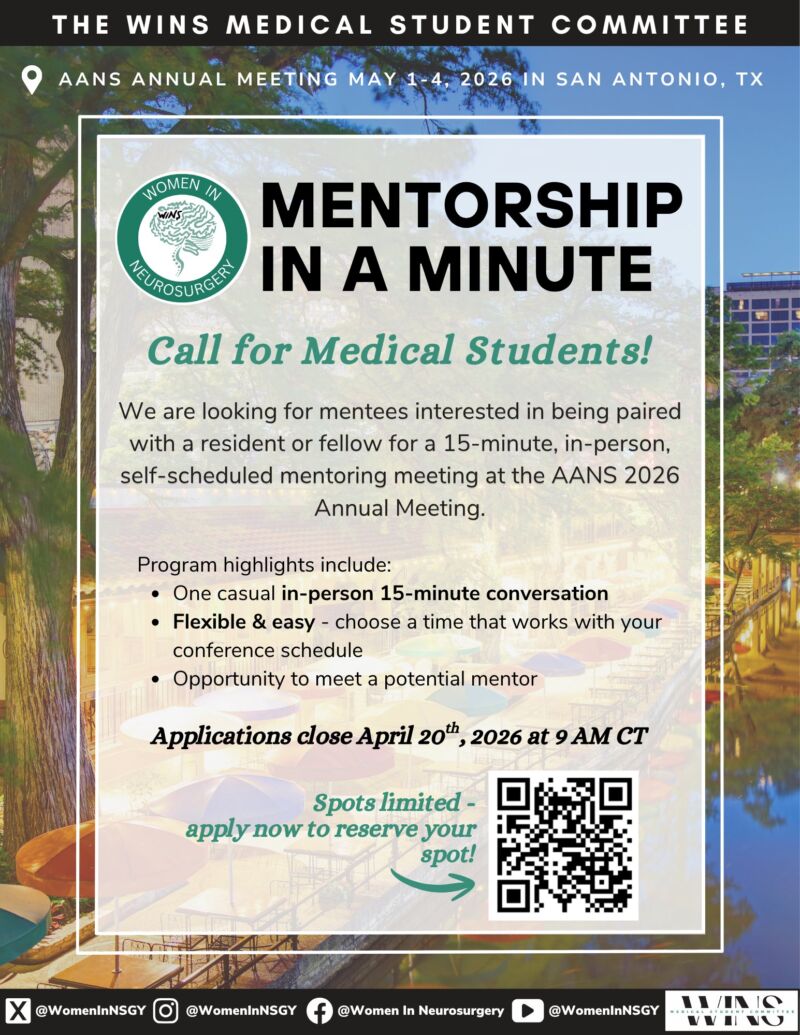 Calling all resident mentors! Join Mentorship in a Minute at #AANS2026 to connect with medical students interested in neurosurgery and help shape the future of neurosurgery.