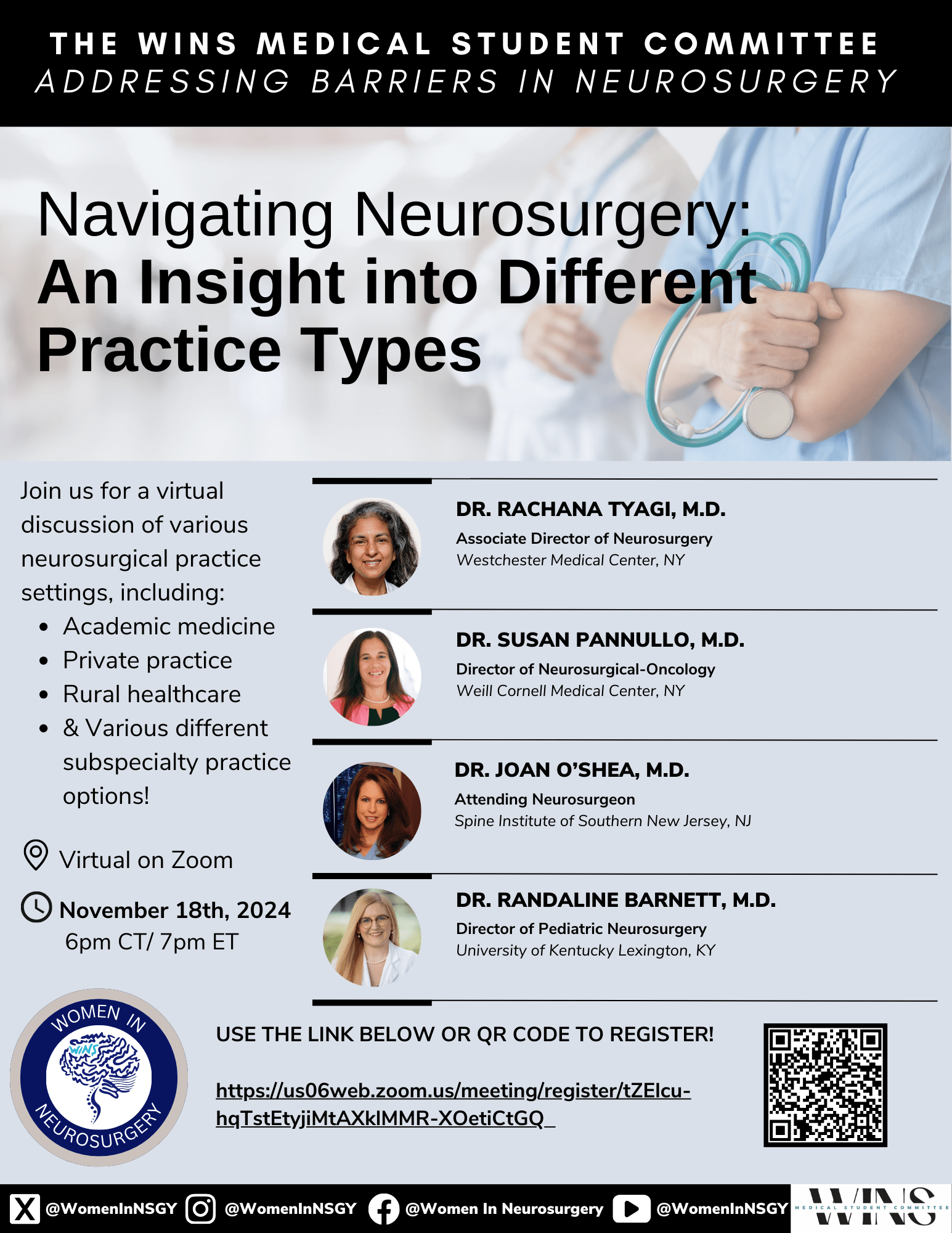 🔍 Discover your path in neurosurgery! Whether it’s academic medicine, private practice, or rural healthcare, this virtual event covers it all! Explore peds, spine, and tumor subspecialties too! Don’t forget to register today!